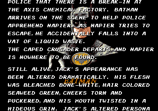 Одна из многочисленных игр с участием Бэтмена. Тёмный рыцарь вооружён руками, ногами и конечным числом бумерангов. Также у него с собой "кошка" - комбинация крюка и верёвки, помогающая забраться повыше. Порой на врагов можно напрыгивать сверху, как во втором Терминаторе на Денди. Есть этапы на машине и самолёте. Хоть игровой процесс не может похвастаться чем-то особенным, зато музыка в игре замечательная.