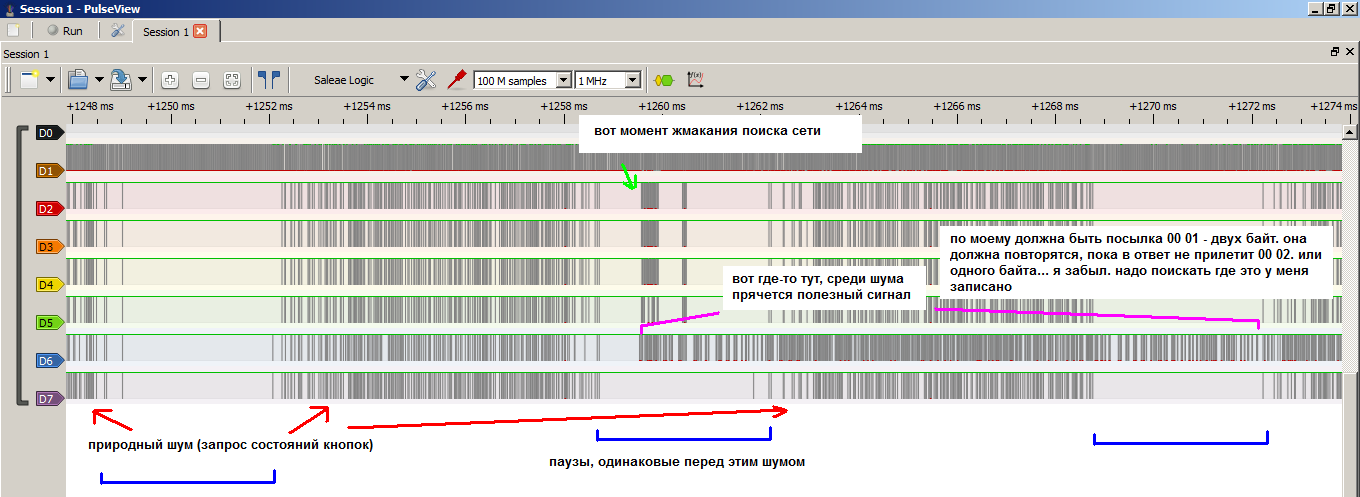 как оказалось эти самые порты безконца бомбят проверки. я по наивности предполагал что там чистая полоска, как у мертвеца, и только в моменты жмакания кнопок что-то да происходит, но нет. там получается все время идет шум. что заметно усложняет задачу. получается в момент, когда попер нужный сигнал - надо будет отсеивать этот "природный" шум, чтобы выделить именно нужные нам пакеты. уже на этом как бы дизмораль и можно заканчивать... так и знал что куплю эту приблуду, и закину в шкаф ко всем старым моим игрушкам, которые валяются без дела. поэтому то и просил того раздолбая перетыкнуть и посмотреть что будет. шлю ему второй раз лучики поноса.