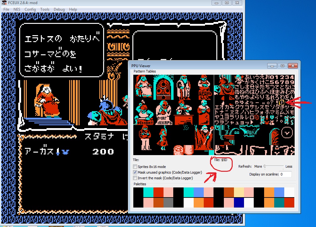 E870. Теперь отладчик останавливается после декодирования символов, но до записи на экране (можете проматывать время назад для удобства), для продолжения F5, для отключения остановок снять галочку в списке Breakpoints. Когда будет остановка, смотрите в Debugger выше жёлтой строки CPX $AA, после = размер строки текста, например = $0A, в окне Memory Tools с выбранным CPU Memory смотрите байты с $3A0, например, 44 28 2A 3D 33 47 32 61 45 4B, это байты в роме, а индексы тайлов с $3DC, например, 47 1A 25 3C 2E 4A 2D 38 48 4E, т. е. то, что вы знаете и что вам нужно превратить в байты в роме (с $3A0) для поиска.